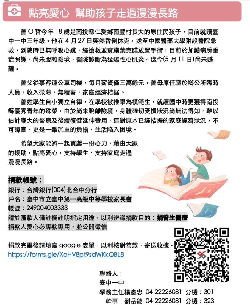 最近母校高三曾姓學弟因猛爆性心肌炎在加護病房照護中,目前仍呈現半昏迷狀態。曾姓學弟在原鄉出生長大,父親擔任公車司機,母親是公所臨時人員,父母為處理孩子醫療事宜,已暫停工作一段時間,家庭暫無收入,後續的醫療復健所需費用可能讓家庭經濟狀況更加雪上加霜,希望能夠藉由大家愛心捐款,一起幫助曾生家庭渡過難關。